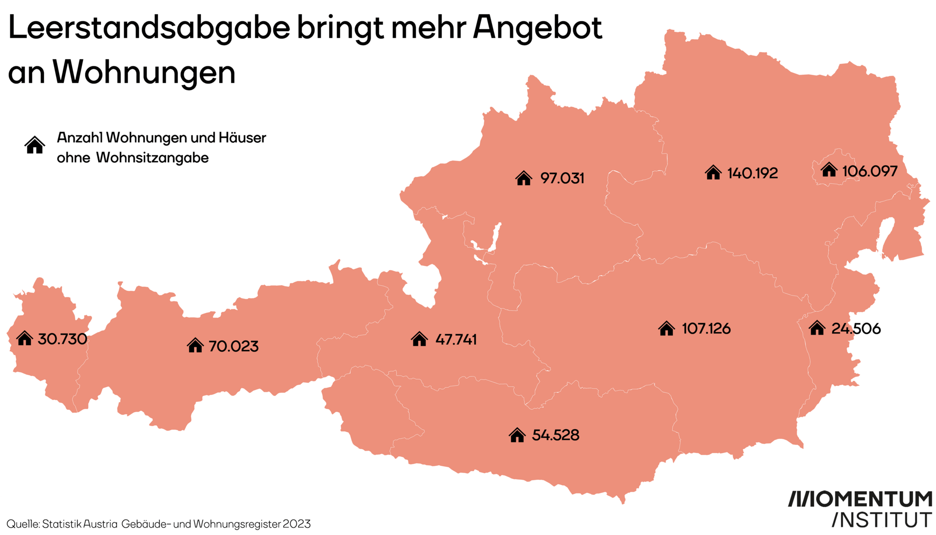 Hunderttausende Wohnungen stehen leer, während die Mieten steigen. Mit klug ausgestalteten Leerstandsabgaben der Länder und Gemeinden könnten potenziell bis zu 678.000 leerstehende Wohnungen wieder fürs Wohnen mobilisiert und zudem wichtige Einnahmen generiert werden. Eine konsequent ausgestaltete Leerstandsabgabe kann also doppelt wirken: Sie mobilisiert Wohnraum und entlastet das Budget.