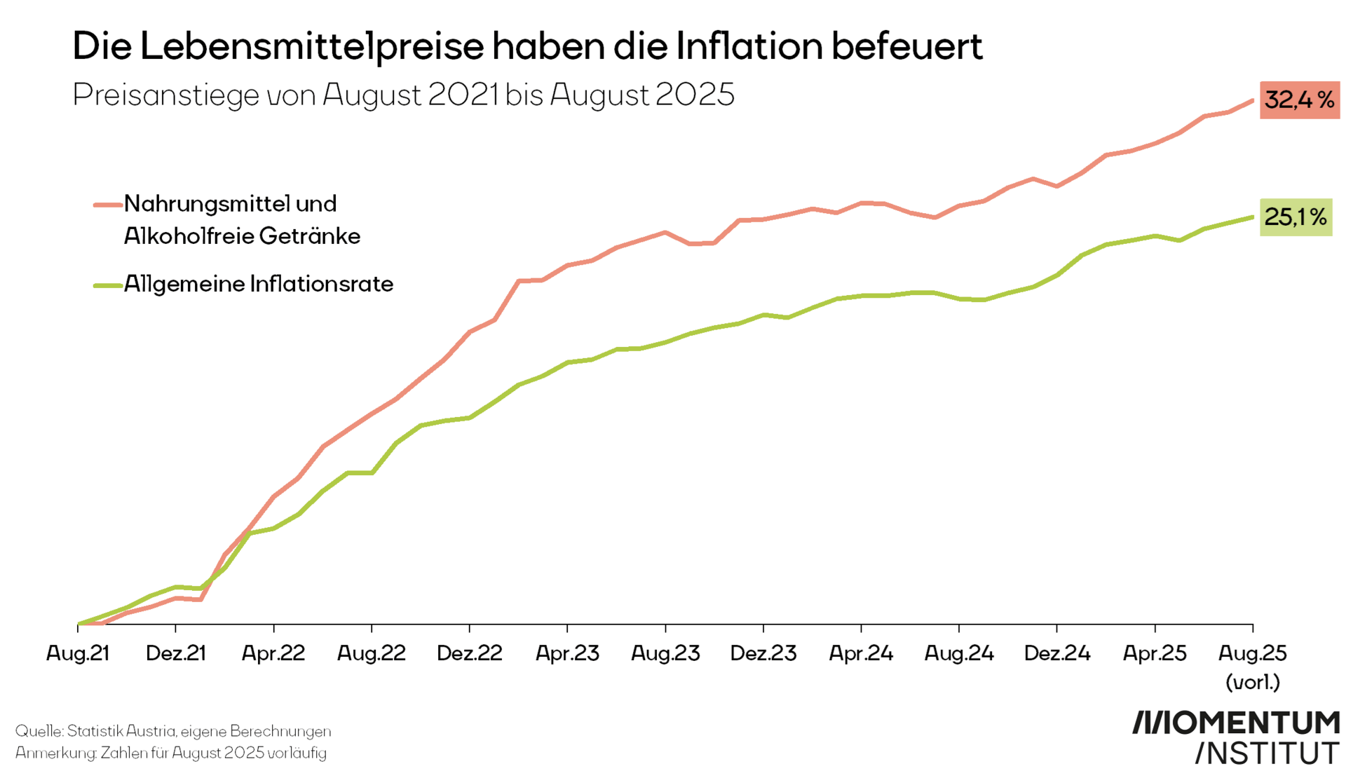 In den letzten vier Jahren sind die Lebensmittelpreise stärker gestiegen als die Preise insgesamt. Die Preise für Lebensmittel sind seit August 2021 – der Beginn der starken Teuerung – um 32,4 Prozent gestiegen. Die allgemeine Teuerung lag mit 25,1 Prozent deutlich darunter.