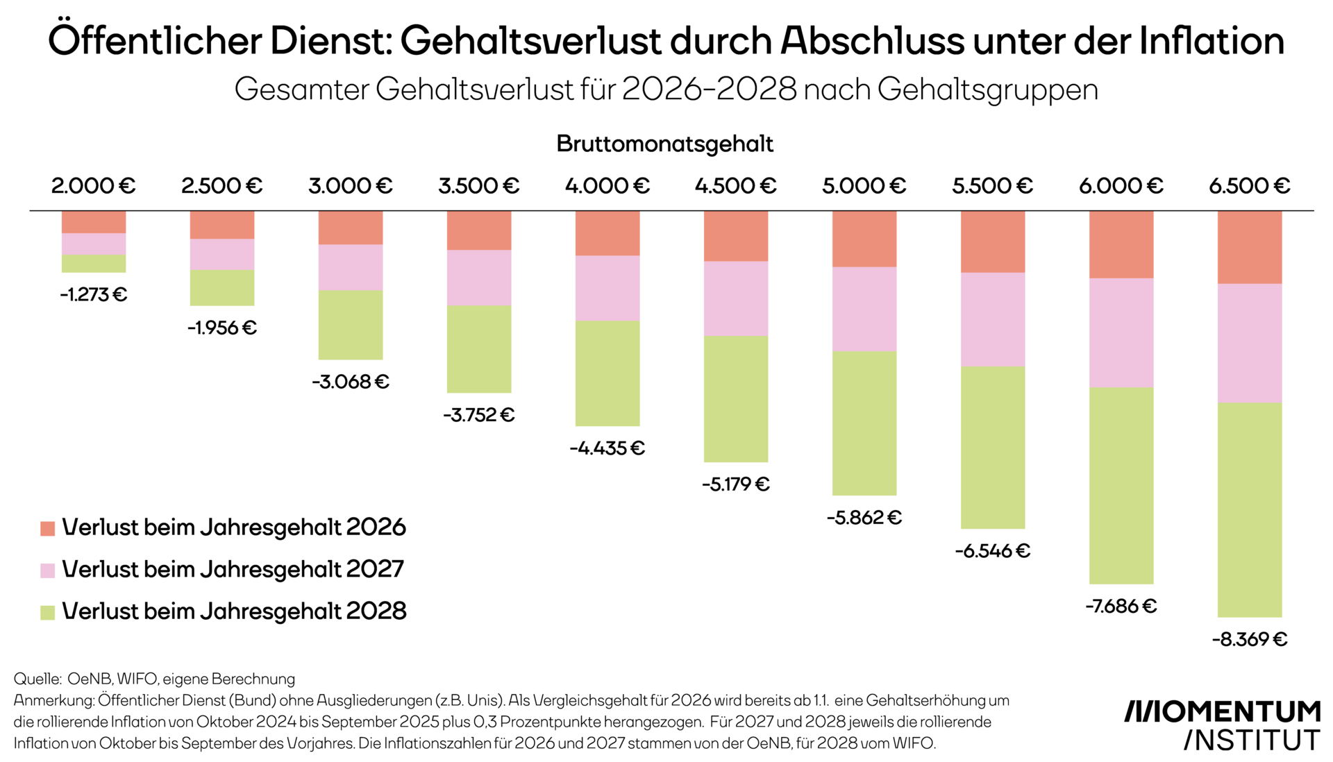 Die Bundesregierung hat den Gehaltsabschluss der öffentlich Bediensteten wieder aufgeschnürt. Die Gehälter bleiben in den nächsten drei Jahren hinter der erwarteten Teuerung zurück. Das kostet die Beschäftigten Geld. Das Momentum Institut hat einen Vergleich des tatsächlichen Gehaltsabschlusses mit einer vollen Abgeltung der Teuerung in den kommenden drei Jahren angestellt. Eine Person mit 2.500 Euro brutto Monatsgehalt – etwa ein:e pädagogische:r Assistent:in im Kindergarten – bleibt um 1.956 Euro brutto hinter der Teuerung zurück (aufsummiert über die kommenden drei Jahre). Verdient man 6.000 Euro monatlich brutto – etwa ein:e Lehrer:in mit jahrzehntelanger Berufserfahrung – fehlen zum vollen Ausgleich der Inflation 7.686 Euro.